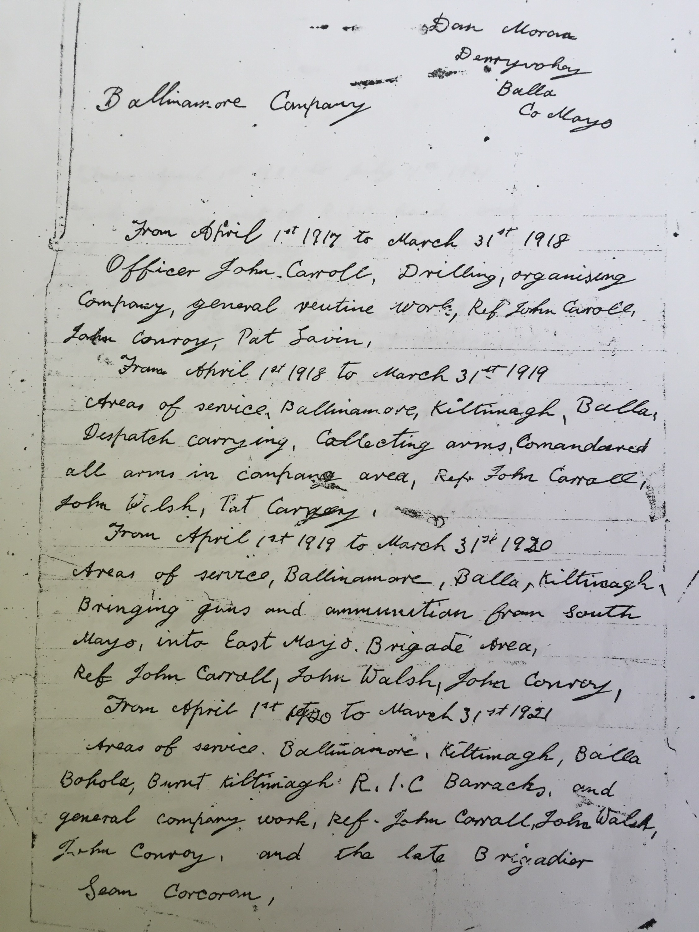 Many thousands were awarded medals and pensions during this time. Below is the account of Dan Moran from Derryvohey, Craggagh (Mr Charlton’s grandfather) who was also awarded his medals in 1971.