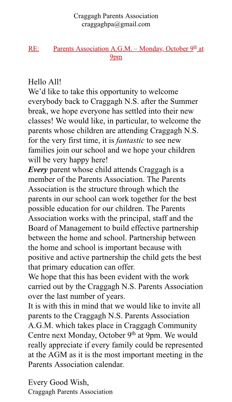School NewsParent Association AGM Oct 9th at 9pm. Details: October 3, 2017August 26, 2020 craggaghns Our Parent Association AGM will take place in the Community Centre on Monday, October 9th at 9pm. Notice from our PA is posted below: Share this: Click to share on X (Opens in new window) X Click to share on Facebook (Opens in new window) Facebook Like Loading...