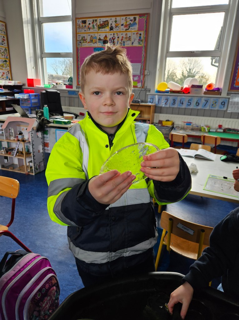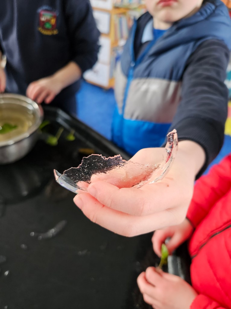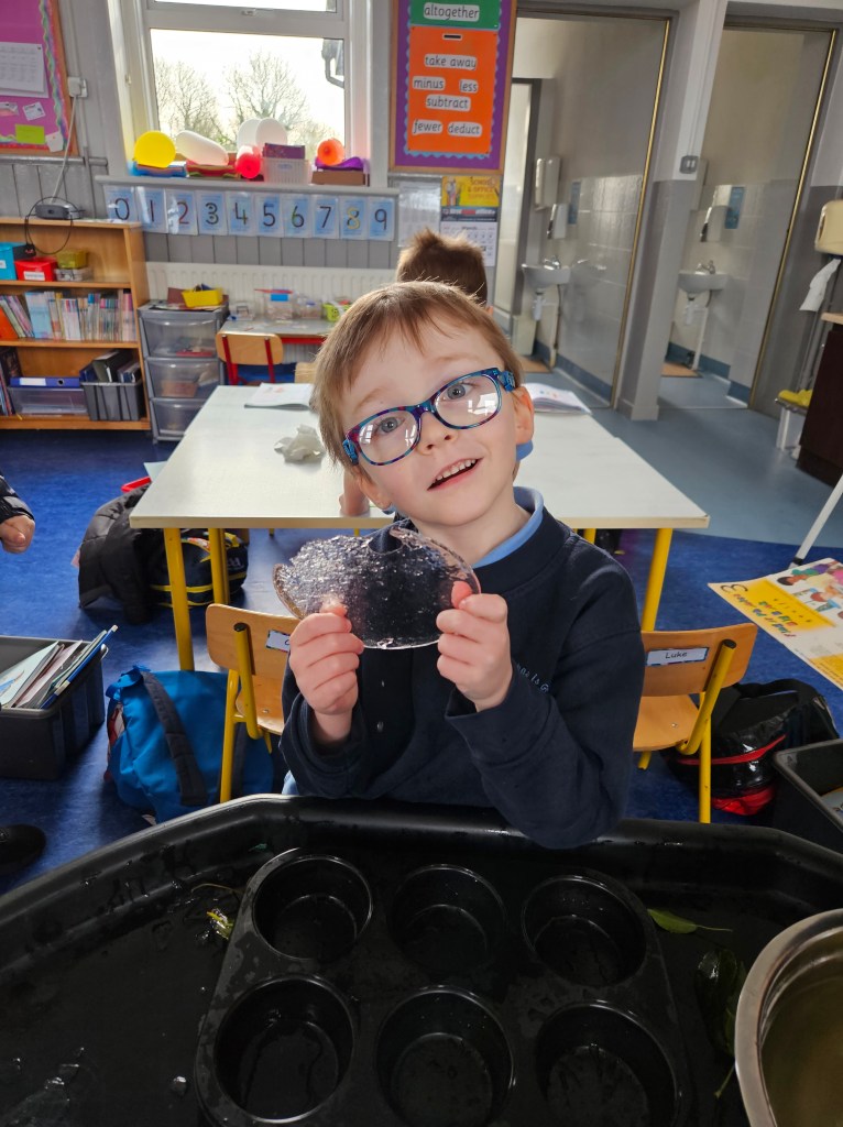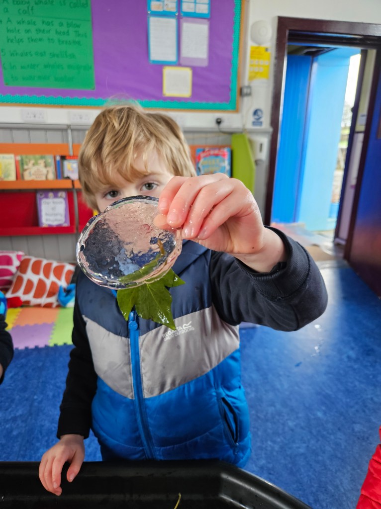 We had lots of fun exploring the effects of freezing weather in our outdoor classroom today. The water in our mud kitchen had frozen, so we brought it inside to our Tuff Tray for some play and exploration!