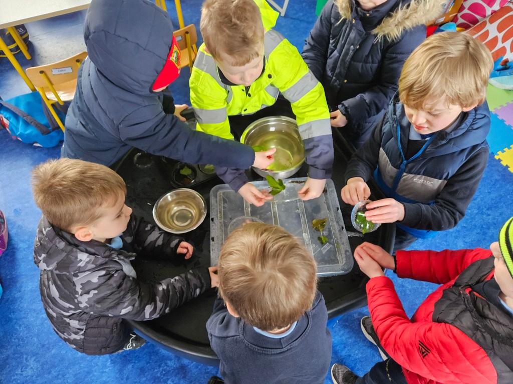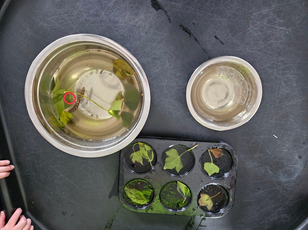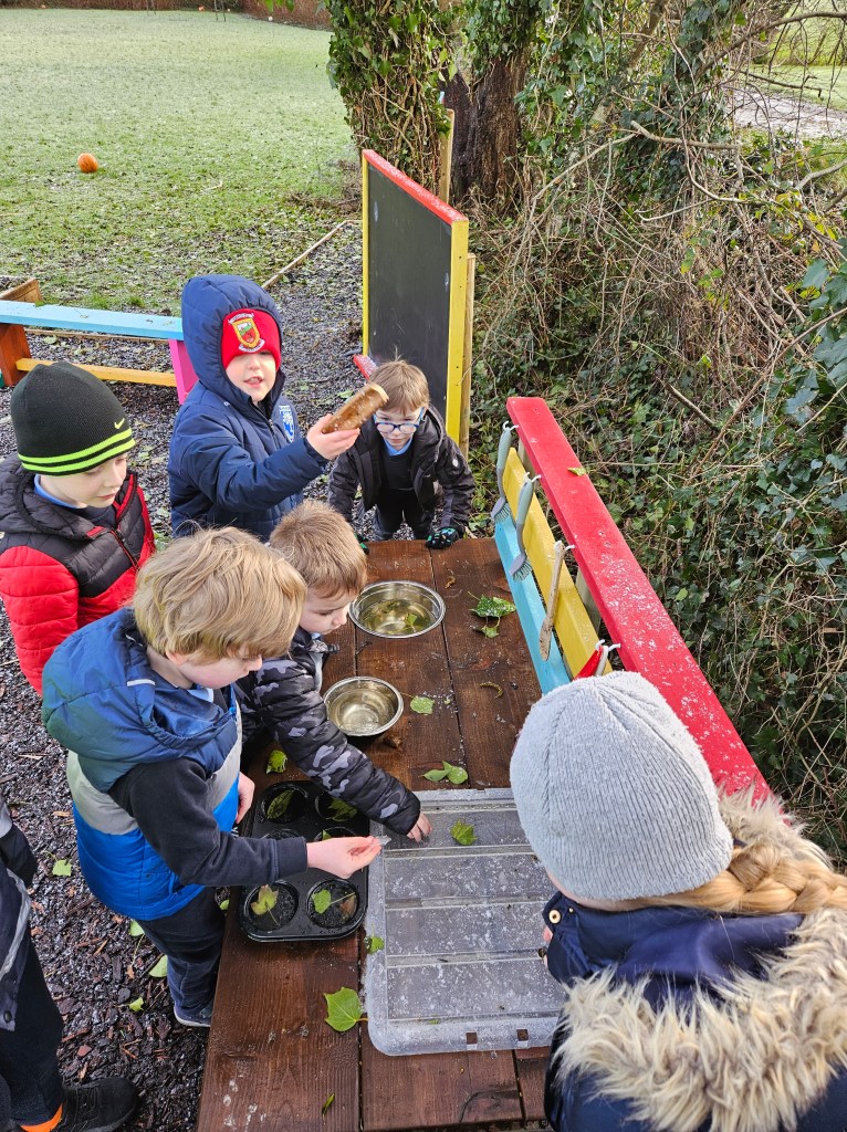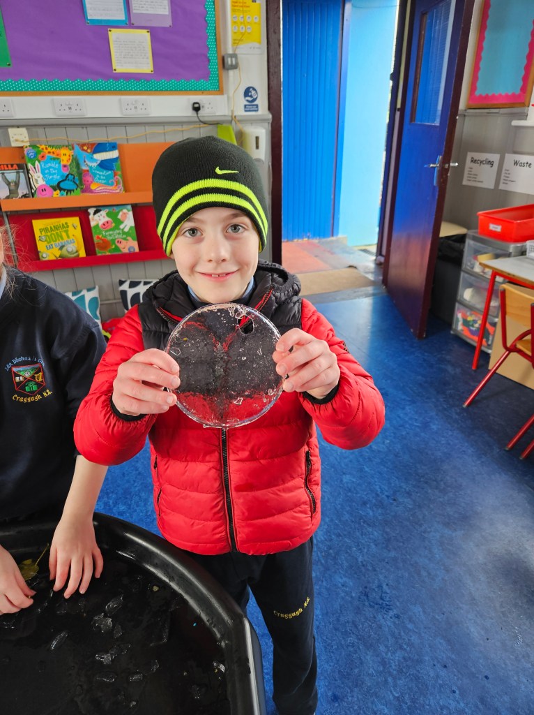We had lots of fun exploring the effects of freezing weather in our outdoor classroom today. The water in our mud kitchen had frozen, so we brought it inside to our Tuff Tray for some play and exploration!